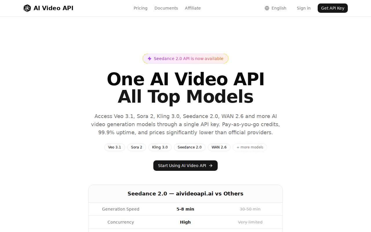 AI Video API provides access to top AI video models (Veo 3.1, Sora 2, Kling 3.0, Seedance 2.0, WAN 2.6) via a single API key with pay-as-you-go pricing, 99.9% uptime, and cost-efficient scaling for production AI video generation.
