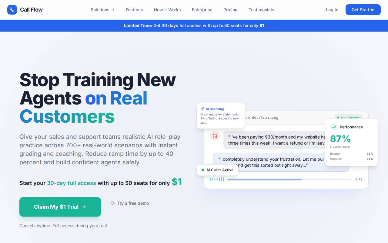 Call Flow is an AI-powered call training platform for sales and support teams. It delivers 700+ realistic scenarios with instant grading and coaching, a custom scenario builder, and supervisor dashboards to speed ramp time, improve CSAT, and reduce agent turnover.