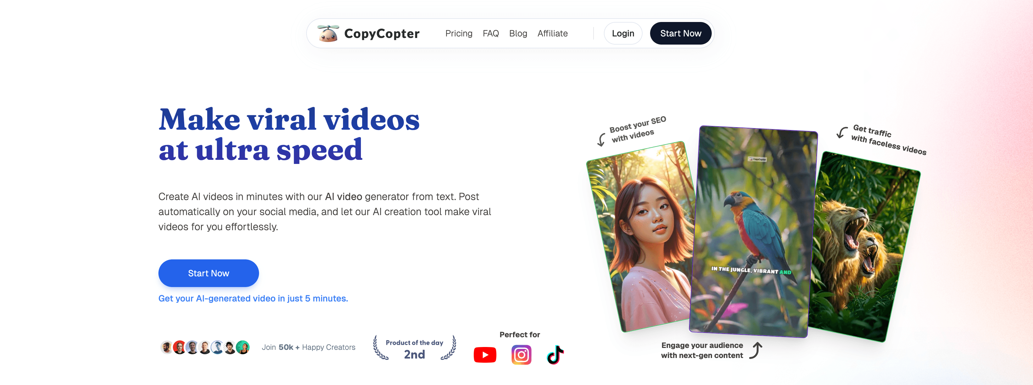 CopyCopter is an AI text-to-video generator that helps users transform long-form content into engaging videos suitable for social media. This tool automates the content distribution process, saving time while enhancing reach and engagement with audiences.