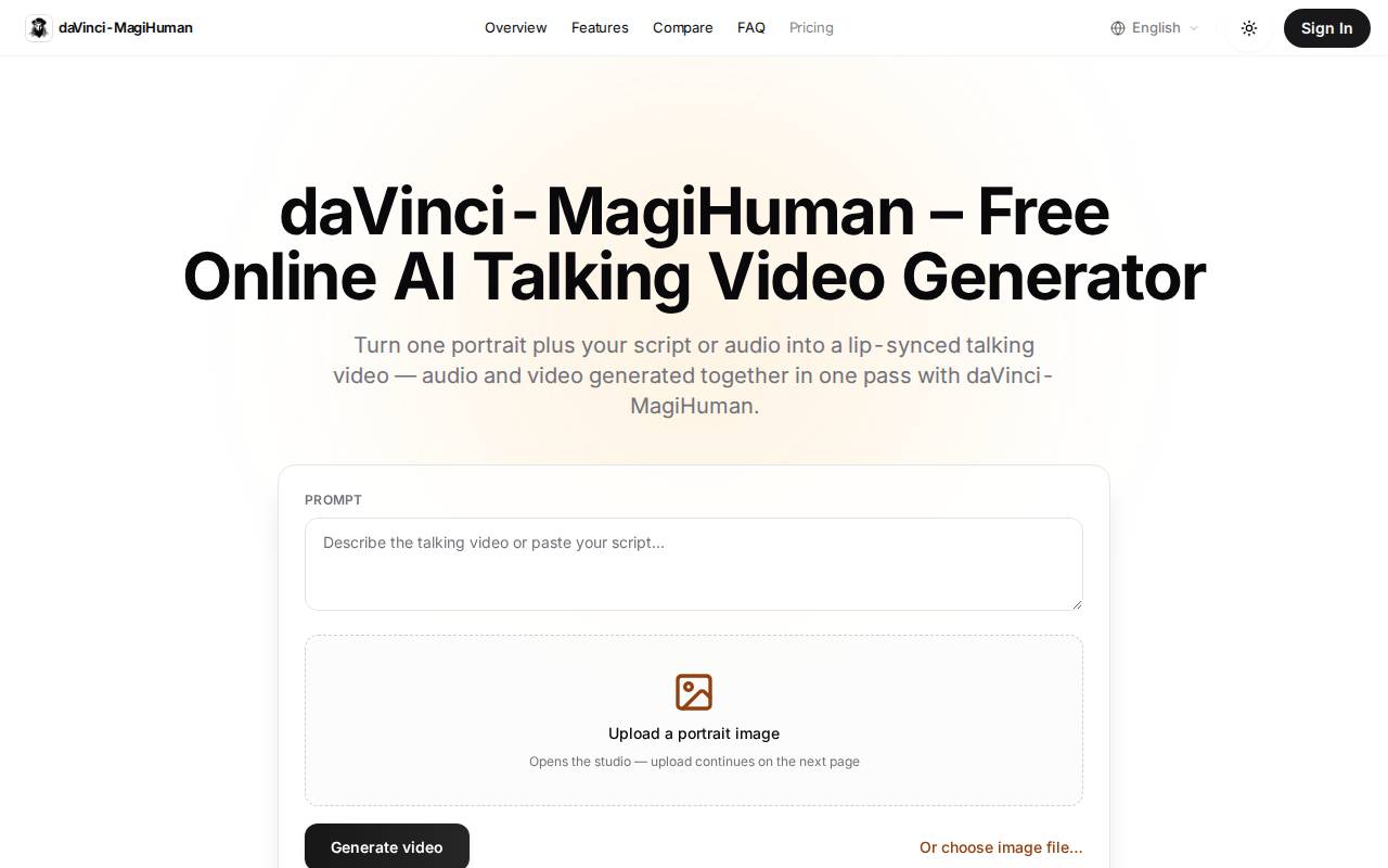 daVinci-MagiHuman is an open-source AI model that turns a single portrait plus text or audio into a lip-synced talking video, with audio and video generated in one pass. Self-hostable and released under Apache 2.0, it supports fast inference on NVIDIA GPUs.