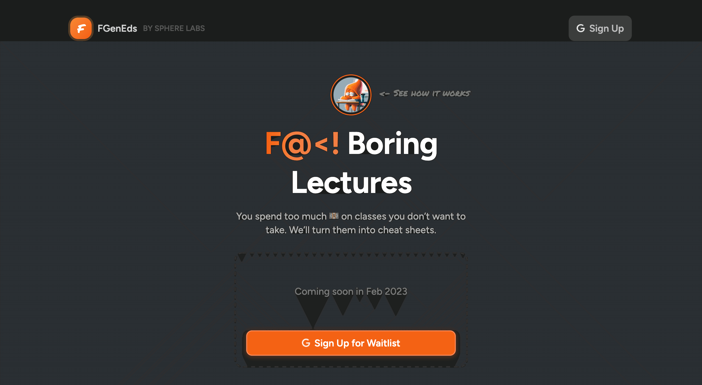 FGenEds provides users with cheat sheets for general education classes. It allows users to upload a PDF of the lecture slides and transforms the material into an easier to digest format. It also includes a Privacy Policy and Terms of Service.