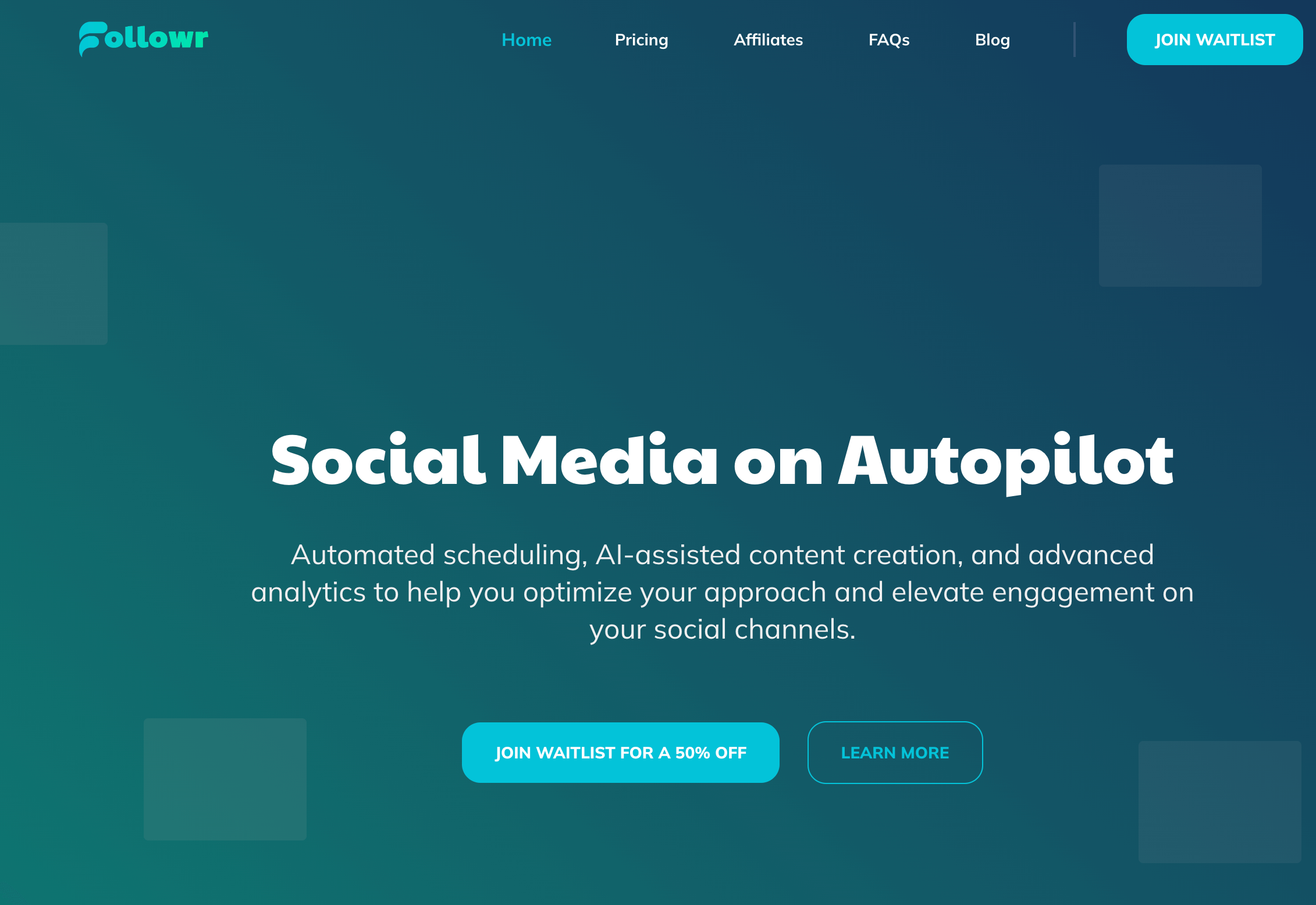 Followr is an AI-powered social media management platform. It provides features for: 1. Content Creation: It likely uses AI to help generate or suggest content for social media posts. 2. Scheduling: It allows users to schedule their posts for optimal times or specific dates. 3. Analytics: It provides insights and data about the performance of your social media posts. The platform aims to save users time and enhance their online presence by automating and optimizing various aspects of social media management. However, specific details about its features or how it works are not available from the website's metadata.