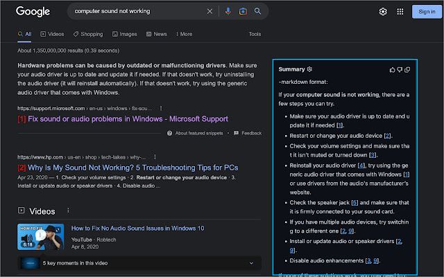 Glarity - Summary for Google/YouTube (ChatGPT) is an open-source browser extension that displays a summary of ChatGPT in Google search results and in Youtube. It is free to use, and supports websites such as Yahoo!, PubMed, PMC, NewsPicks, Github, Nikkei, Bing, Google Patents. No ChatGPT/OpenAI account is required.