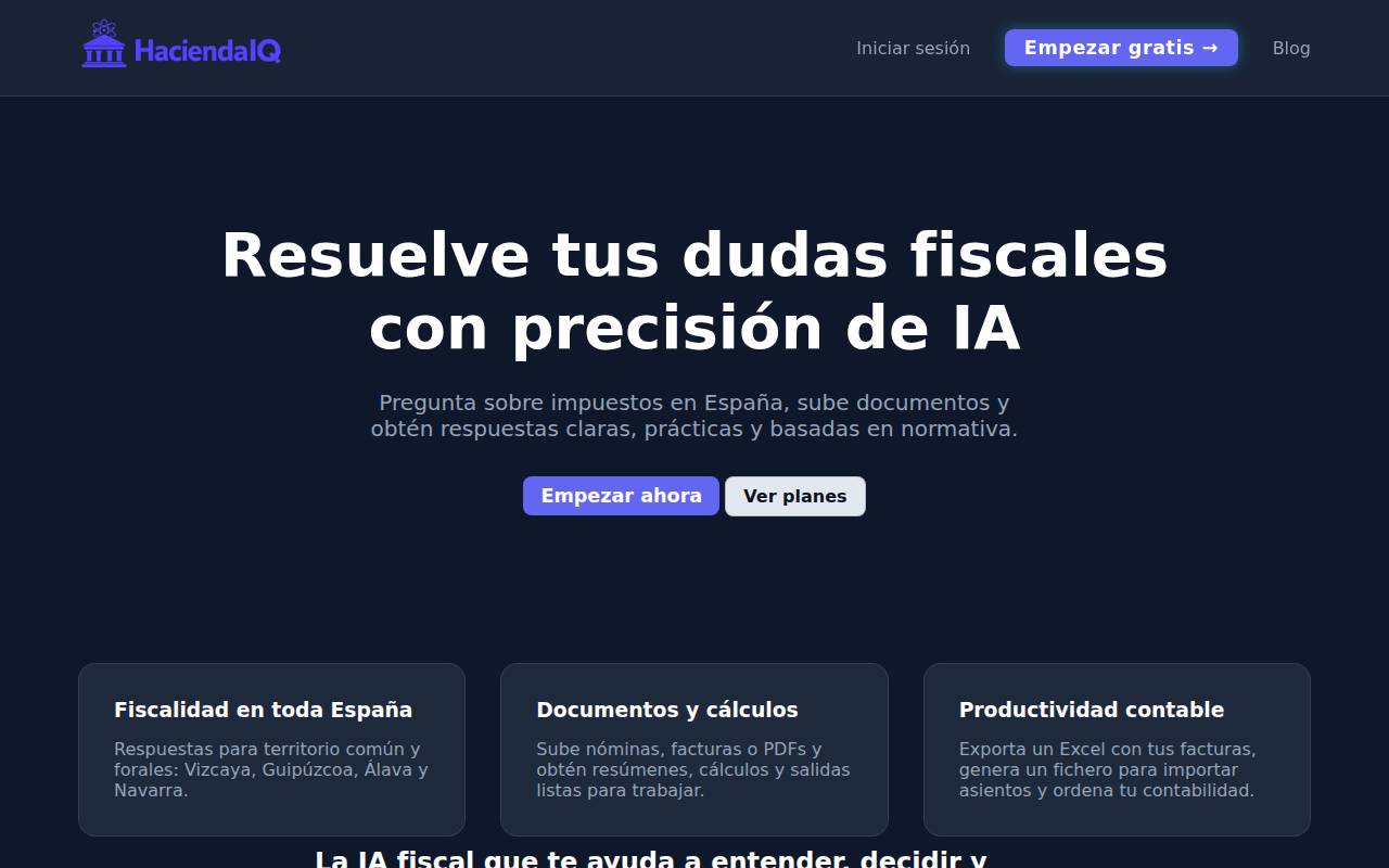 HaciendaIQ es una IA especializada en fiscalidad y gestión documental que analiza nóminas, facturas y PDFs, extrae datos relevantes y los exporta a XLSX, JSON o SQL, generando salidas listas para contabilidad y reporting para acelerar tu flujo de trabajo. Compatible con Bizkaia, Gipuzkoa, Álava y Navarra.
