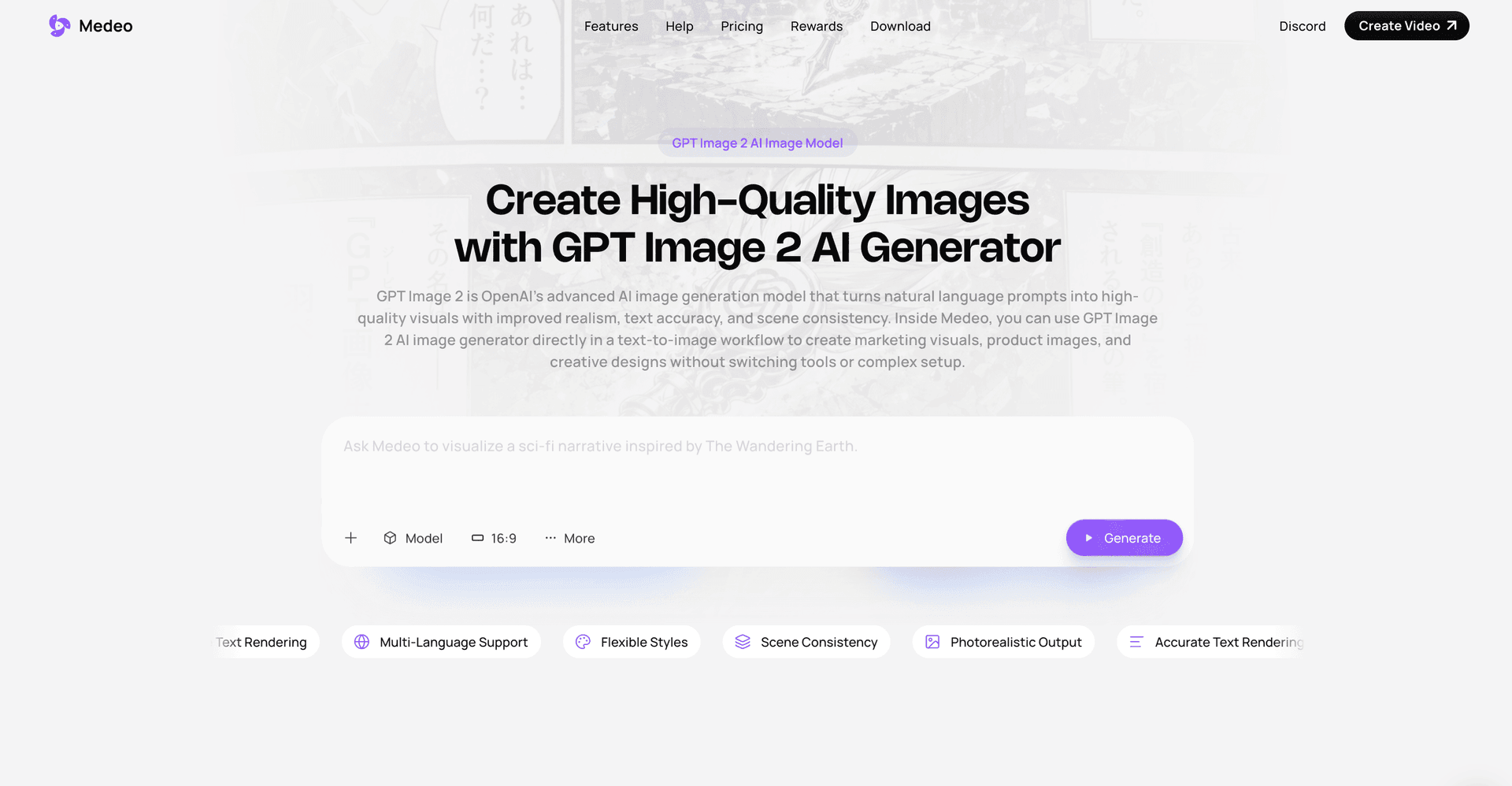 GPT Image 2 is OpenAI’s advanced AI image generation model that turns natural language prompts into high-quality visuals with improved realism, text accuracy, and scene consistency. Inside Medeo, you can use GPT Image 2 AI image generator directly in a text-to-image workflow to create marketing visuals, product images, and creative designs without switching tools or complex setup.