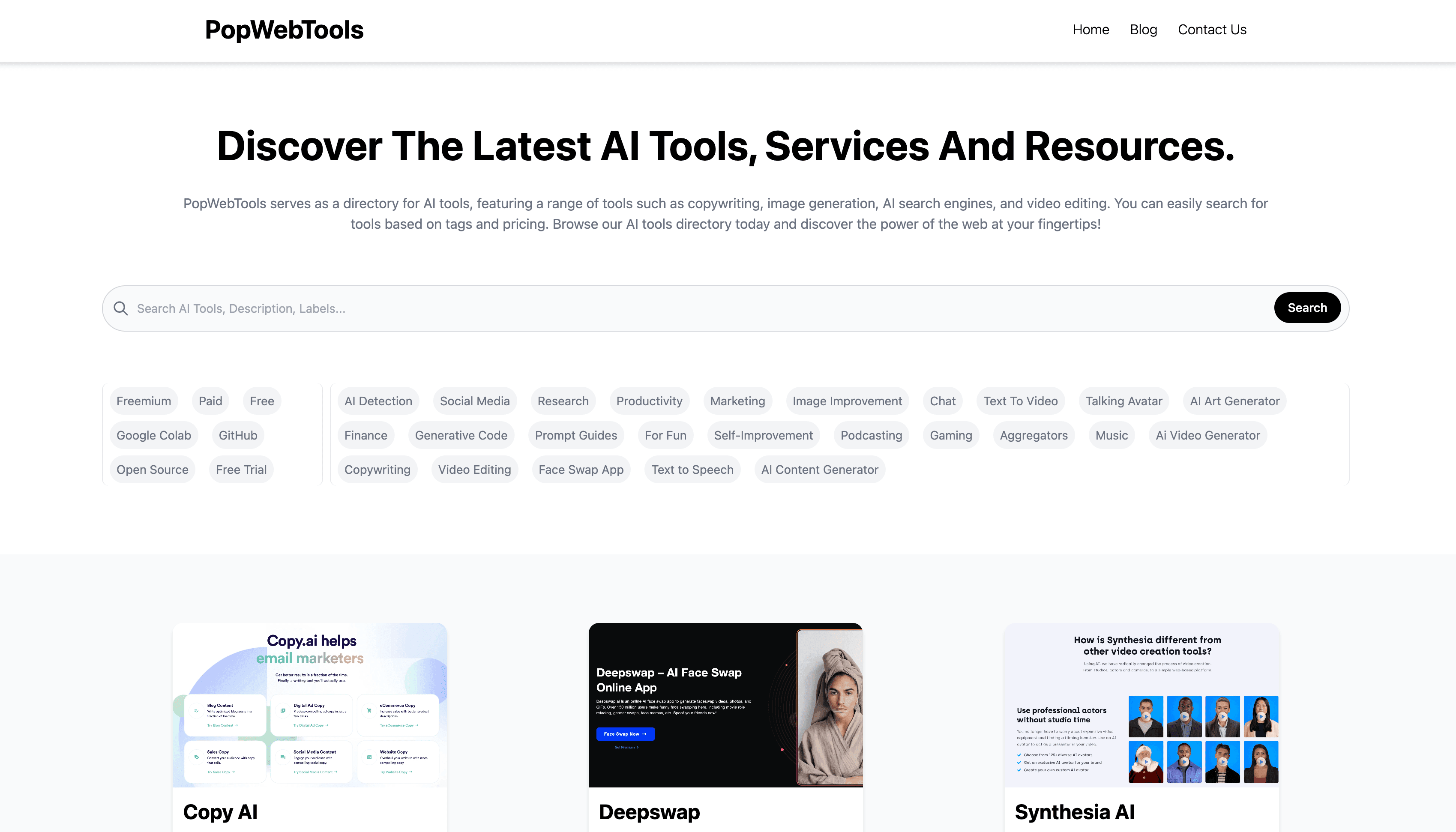 PopWebTools serves as a directory for AI tools, featuring a range of tools such as copywriting, image generation, AI search engines, and video editing. You can easily search for tools based on tags and pricing. Browse our AI tools directory today and discover the power of the web at your fingertips!