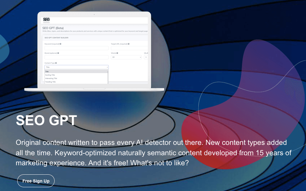SEO GPT is a free content generator built on the GPT-3 language model. It is specifically designed to understand and analyze web pages to produce keyword-optimized, naturally semantic content that is both human-readable and search engine-friendly. SEO GPT has 100+ ways to create and optimize titles, descriptions, and other short content, which can help businesses increase their search engine rankings, conversions, and overall ROI.