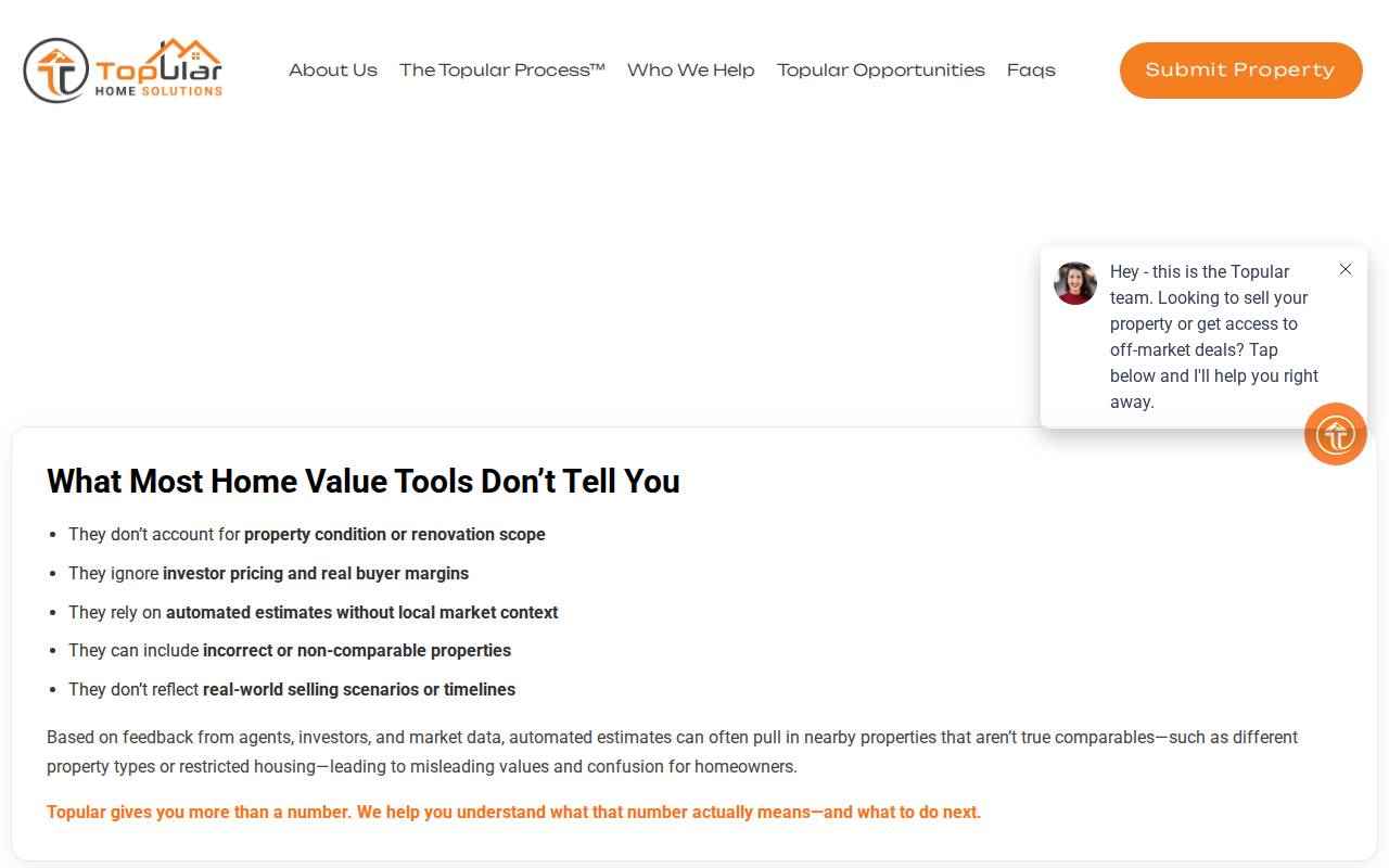 Topular AI analyzes real estate data, property condition, and live market activity to deliver a true value range with investor insights, enabling homeowners and investors to make informed, confident decisions.
