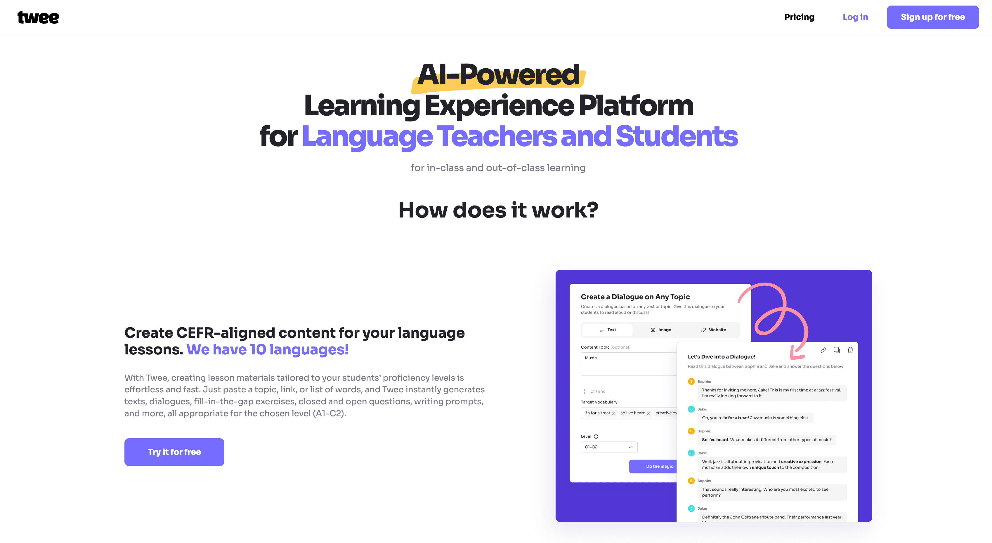 Twee is an AI-powered platform designed for language teachers and students to create customized lesson materials aligned with the Common European Framework of Reference for Languages (CEFR). By simply entering a topic or vocabulary, users can generate various educational resources such as texts, exercises, and writing prompts. The platform also offers assessment tools that automate grading and provide feedback, streamlining lesson planning and management. With over 40 tools available, Twee supports reading, writing, speaking, and listening skills, making language learning more engaging and efficient for diverse student abilities.