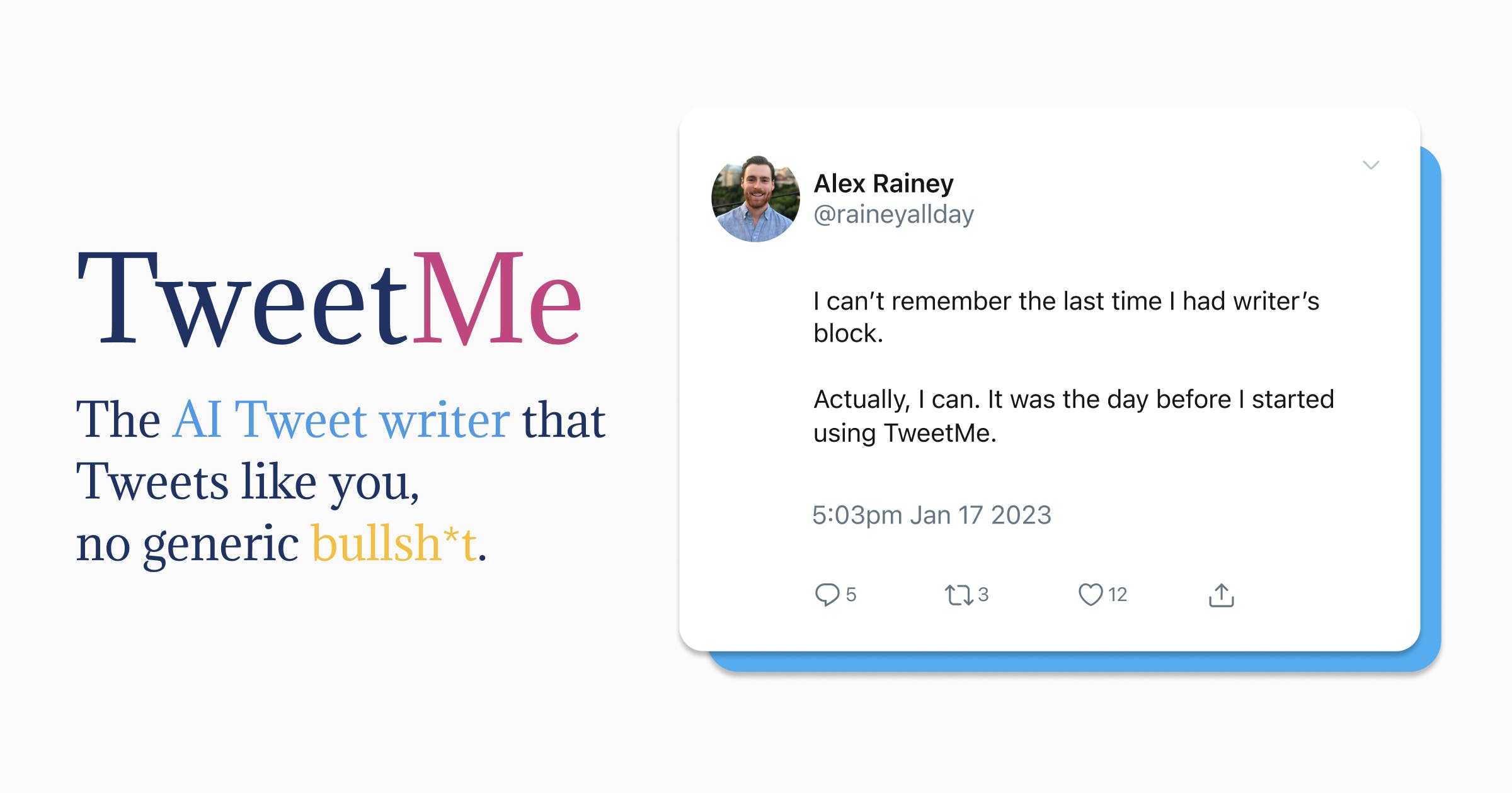 TweetMe is an AI tweet writer that writes like you, no generic stuff. It uses your own tweets and GPT-3 to generate custom AI models. It allows you to generate tweets in less than 2 minutes, and offers a free plan with 10 AI written tweets, and a paid plan with unlimited AI written tweets.