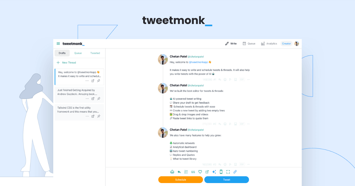 Tweetmonk is a smart Twitter thread editor powered by AI that helps businesses and individuals automate and grow their Twitter accounts. It provides an easy-to-use editor with a simple interface that is smart at the same time and helps make content more engaging and conversion-friendly with AI tools. It also provides powerful analytics to analyze engagement metrics and improve content and increase growth, as well as AI-powered tools to make tweets standout. With Tweetmonk users can also write and schedule tweets and threads, generate relevant hashtags, get inspired by examples of popular tweets, queue content in seconds, and boost their content with one-click scheduling.