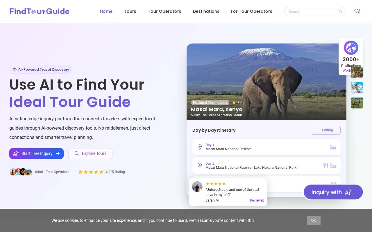 FindTourGuide is an AI-powered travel inquiry platform that connects travelers with trusted local tour operators, letting you discover tours, receive free personalized quotes, and book directly with local guides—no middlemen and smarter travel planning.