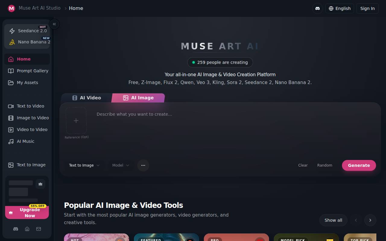 MuseArt AI is an all-in-one platform for free, unlimited AI image and video generation, featuring intelligent routing across top models like Z-Image, Flux 2, Qwen, Veo 3, Kling, Sora 2, Seedance 2 and Nano Banana 2.