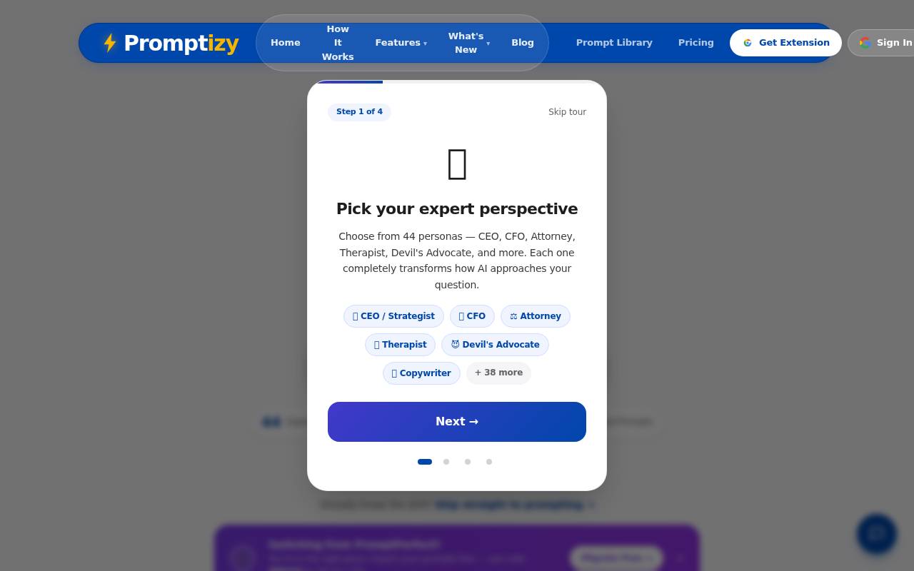 Promptizy turns a single question into expert-level prompts tailored for Claude, ChatGPT and 11 AI tools. It combines 44 professional personas, 130+ templates, 250+ prompts, prompt scoring, Prompt Chain, and a Smart Tool Router to deliver tool-specific prompts that drive faster, higher-quality results.